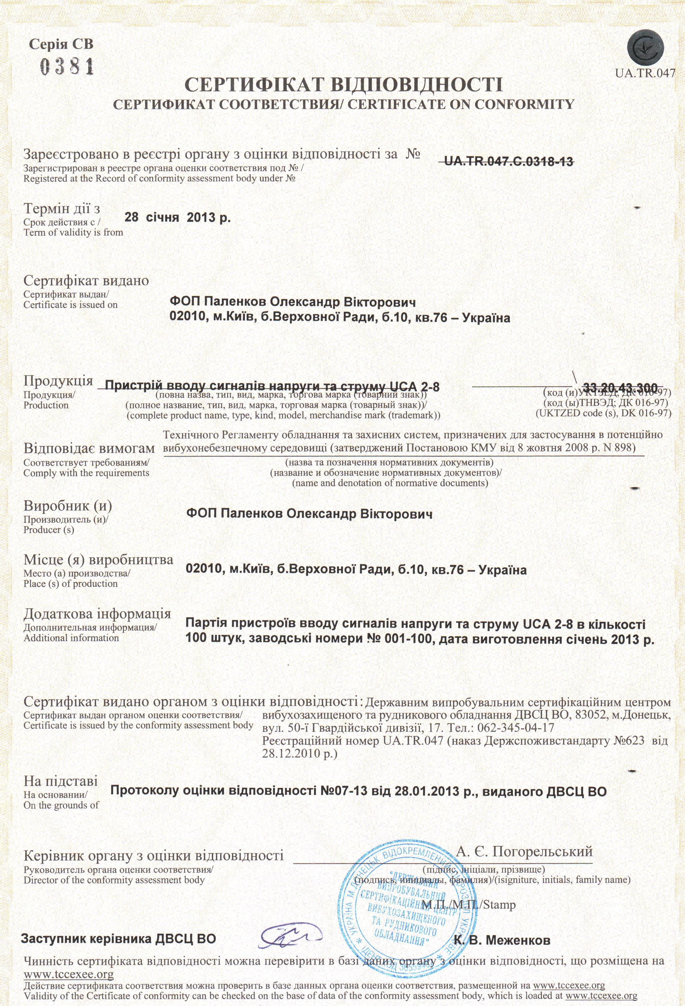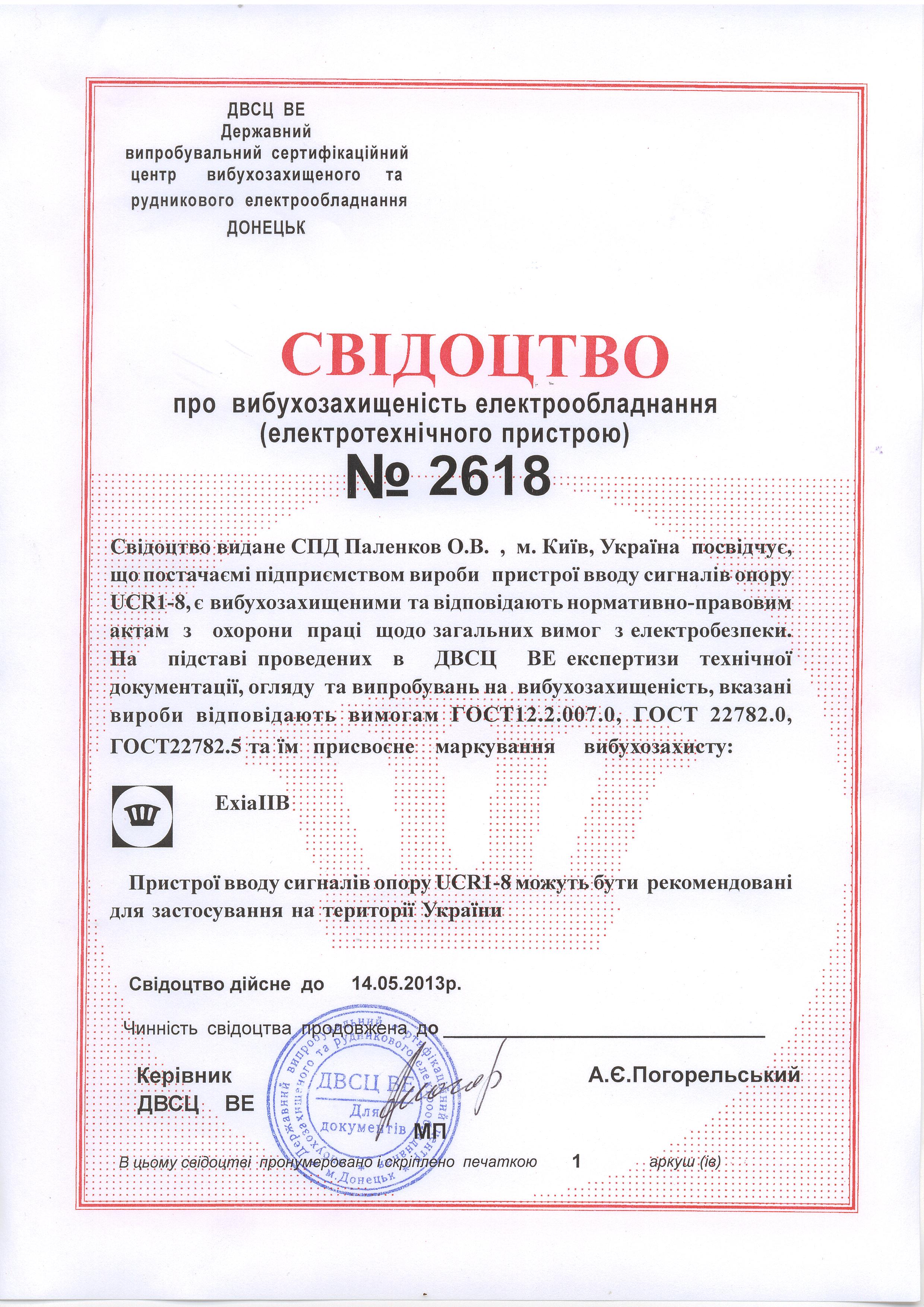 • UCA2-8   Сертифікат іскробезпеки