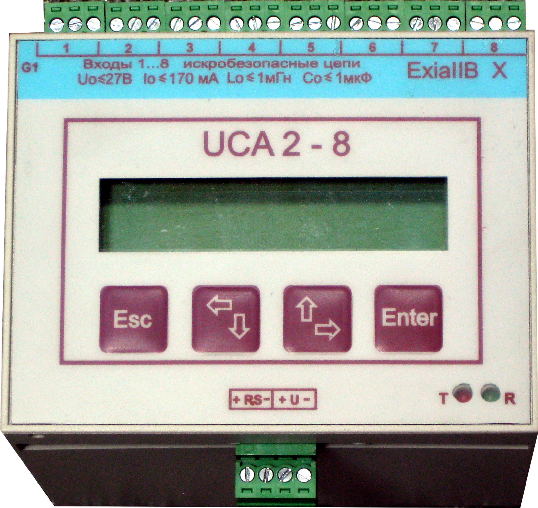 UCА2-8 – містить 8 диференціальних каналів задля перетворення аналогових сигналів напруги ± 5 В і струму 4-20 мА з наведеної похибкою ± 0,2%, вбудовані джерела живлення датчиків струму і напруги, іскробезпечні входи, градуювання, тип каналу, адреса і швидкість в каналі зв’язку встановлюється за допомогою індикатора і клавіатури, час перетворення – 80 мс / канал, смуга частот вхідного фільтра 25 Гц. Детальніше…