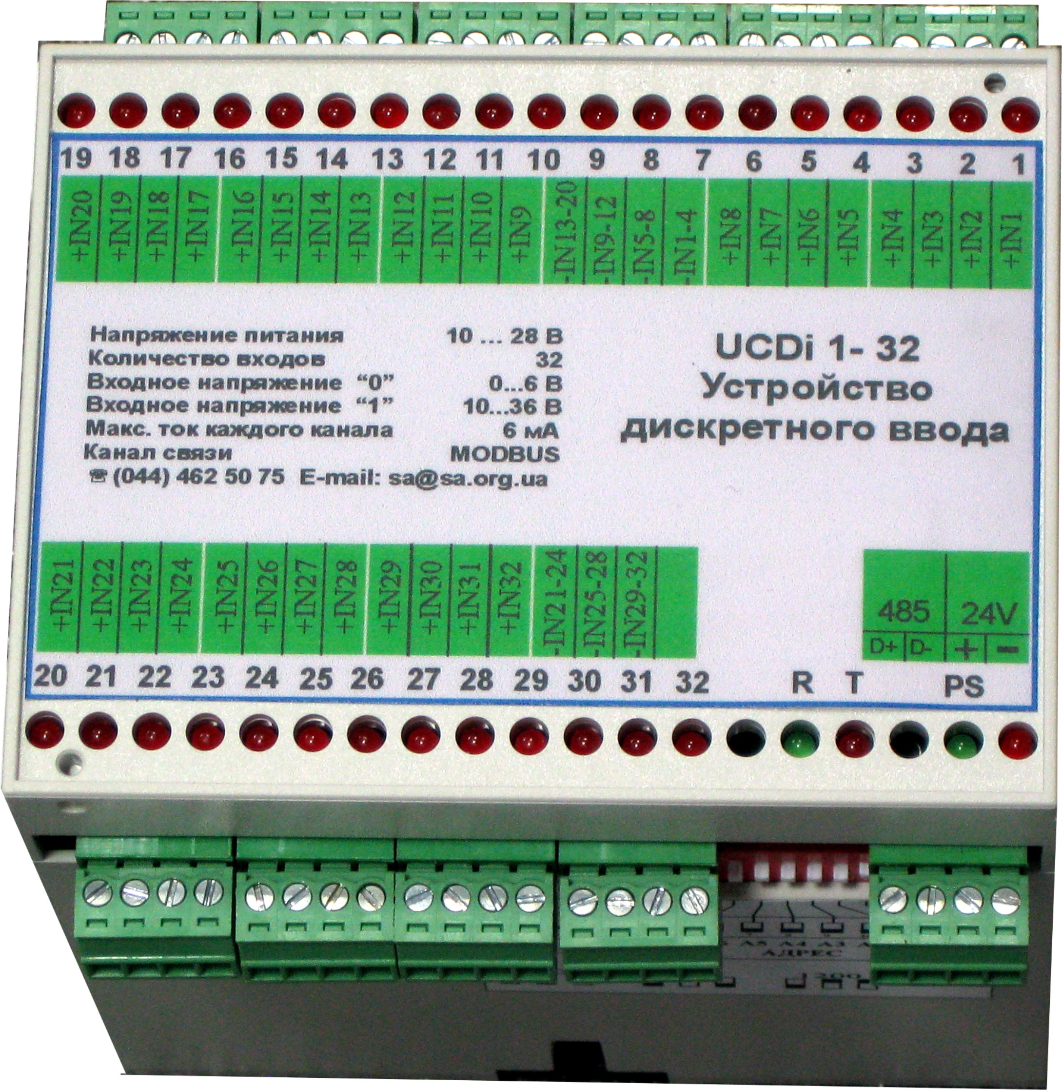 UCDi1-32- містить 32 канали задля вхідних дискретних сигналів напругою 10 … 36 В; канали ізольовані групам і по 4 входи із загальним «-»; вхідний струм не більше 6 мА; адреса і швидкість в каналі зв’язку встановлюється перемикачем на ніжній стінці, на передній панелі розташовані світлодіодні індикатори логічного стану кожного входу. Детальніше…