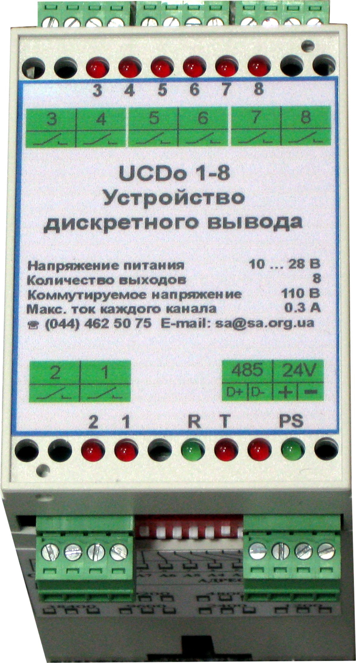 UCDо1-8 - містить 8 взаємно ізольованих каналів комутації вихідних дискретних сигналів з вихідною напругою 120 В і струмом до 0,3 А; адреса і швидкість в каналі зв’язку встановлюється перемикачем на ніжній стінці, на передній панелі розташовані світлодіодні індикатори логічного стану кожного виходу. Детальніше…